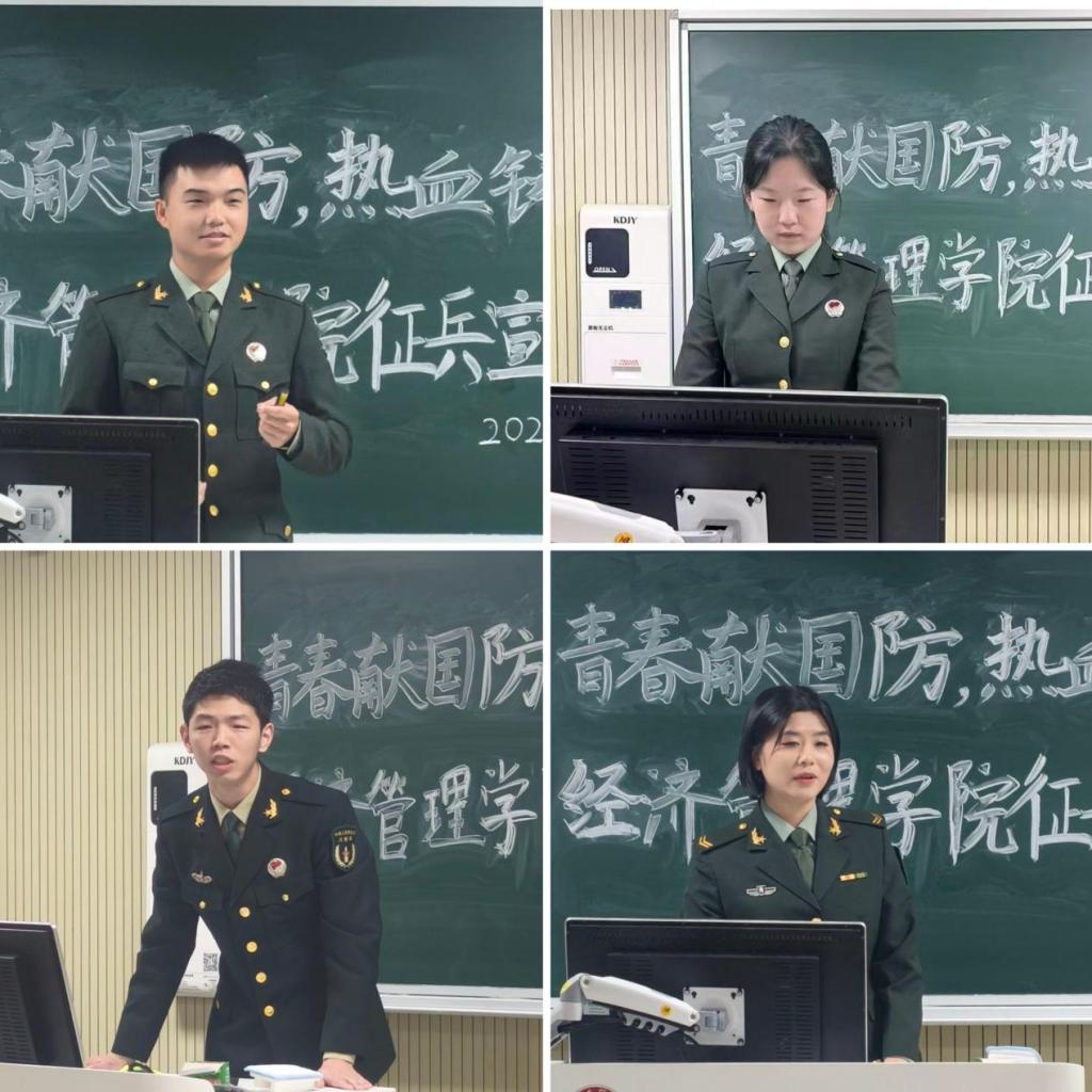 为响应国家号召,激发经管学子投身国防、报效祖国的热情,扎实做好2026年度大学生征兵工作,11月20日下午,经济管理学院“一站式”学生社区在思贤楼102教室开展“青春献国防,热血铸军魂”征兵宣讲会活动。学院党委副书记于媛、毕业生及有参军意愿的学生参加了此次宣讲会。