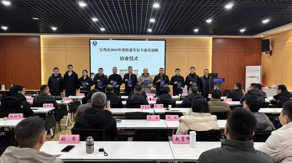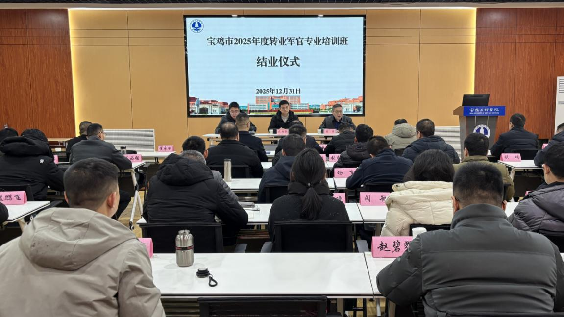 12月31日上午,我院承办的宝鸡市2025年度转业军官专业培训班结业仪式在高新校区尚能楼318报告厅举行。学院院长刘辉、副院长杨嘉歆,宝鸡市退役军人事务局干部安置科马力德主任出席仪式。